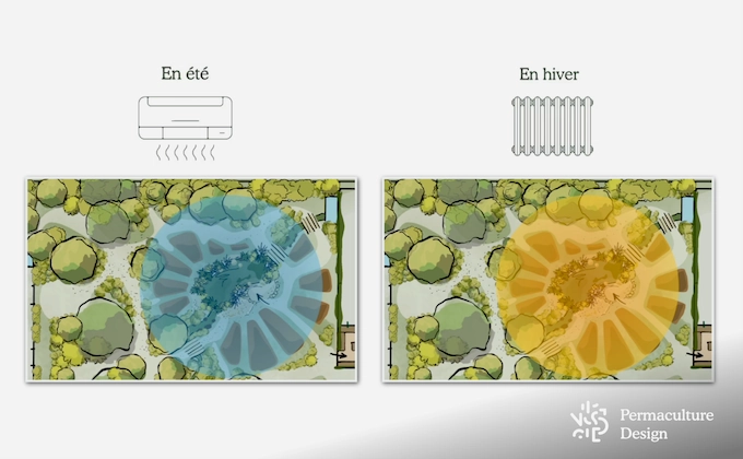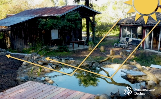 Placée à la manière de ce que l’on appelle un piège à soleil en permaculture, la mare va réfléchir une bonne partie du rayonnement solaire au profit des végétaux voisins qui bénéficieront donc de plus de photons pour une meilleure photosynthèse.
