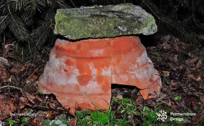 Puis on place le pot retourné à même le sol et on met une pierre dessus afin de boucher le trou du pot et conserver plus de fraîcheur et d’humidité.