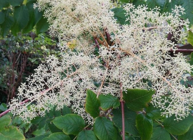 L’angélique du Japon est un arbuste d’allure très exotique, facile de culture. Son tronc effilé paré de courtes épines peu acérées porte au sommet comme une ombrelle de feuillage découpé, qui se pare de teintes chatoyantes à l’automne. En fin d’été, paraît un nuage vaporeux de petites fleurs crème, légèrement parfumées, qui en fait le parfait candidat pour le jardin d’ornement ! La plante est également très mellifère et ses baies noires sont attractives pour les oiseaux.