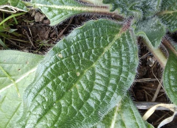 Elle forme au printemps de grosses rosettes de feuilles vert moyen constituées de poils, raides et rugueux. Ces poils très caractéristiques ont la réputation de gêner la progression des limaces, de ce fait la plante est souvent cultivée en périphérie de massifs dans les jardins potagers.