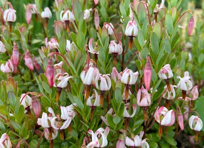 Très rustique, Vaccinium macrocarpon offre un feuillage vert persistant et des petites fleurs roses en été. Celles-ci laissent la place à l’automne aux fameuses baies rouges au goût acidulé, les canneberges, comestibles et diurétiques.