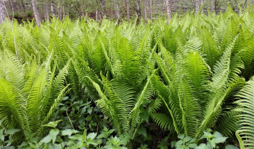 - au printemps, elle forme des crosses — comestibles — avant de dérouler ses frondes organisées en entonnoir et qui peuvent atteindre 1 m de hauteur ;