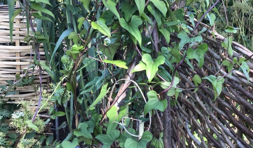 L’igname de Chine est une liane volubile produisant de gros tubercules souterrains et des bulbilles aériennes comestibles. Envahissant dans sa région d’origine, il a plutôt tendance à se développer lentement dans nos régions et offre de nombreux avantages au jardin avec ses qualités de bonne plante couvre-sol, qui aide à lutter contre l’érosion, tout en offrant sa production comestible.