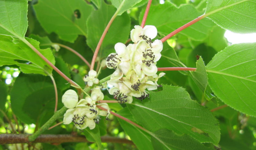 Les kiwaïs sont des plantes grimpantes originaires d’Asie dont les fruits comestibles et délicieux, d’allure semblable aux kiwis, s’en différencient par leur petite taille et leur peau lisse, qui les rend si agréables à déguster. La variété mâle ‘Weima » ne donne pas de fruits, mais est indispensable à la pollinisation des variétés femelles ‘Geneva’, ‘Ken’s Red’ ou ‘Weiki’. Sa floraison estivale parfumée lui confère un attrait supplémentaire.