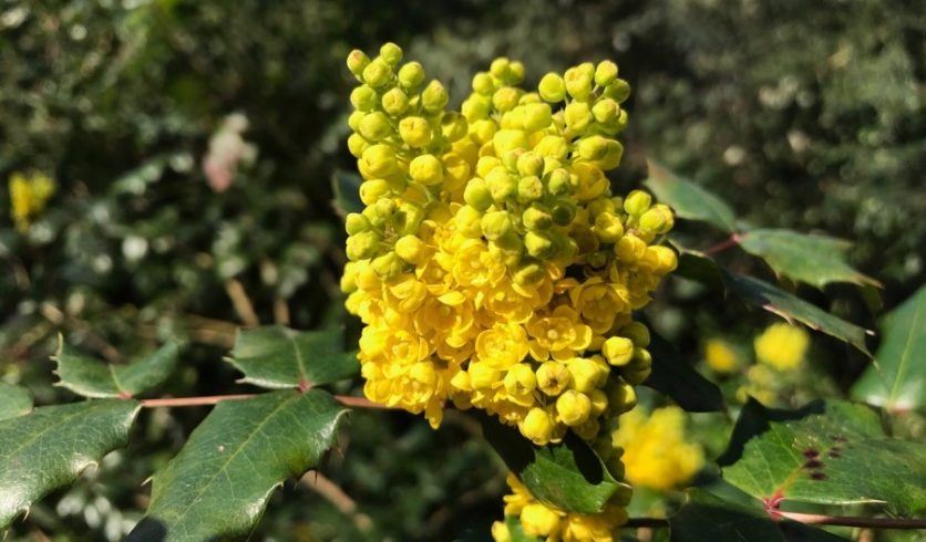 Le Mahonia est un petit arbuste nord américain à la floraison précoce, cousin de l’épine vinette locale (Berberis vulgaris). Dès la fin de l’hiver, ses grappes de fleurs jaunes, délicieusement parfumées, sont un régal pour les sens comme pour les pollinisateurs. Il offre également ses petites baies comestibles, dont la couleur et la forme évoquent celle des raisins rouges. Attention toutefois à ne les consommer que lorsqu’ils sont bien mûrs !