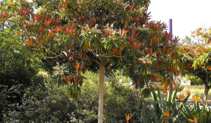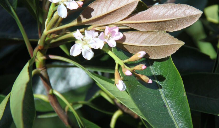 Avec son beau feuillage couleur cuivre au printemps et sa floraison rose pâle très odorante, le cultivar ‘Coppertone’ est très ornemental. Ce néflier hybride issu du croisement entre un Eriobothrya deflexa (proche du bibacier) et un Rhaphiolepis, possède un port buissonnant et se montre très résistant et peu exigeant. Il se cultive comme le néflier du Japon classique (Eriobothrya japonica), et donne de petits fruits comestibles, tout aussi délicieux. L’avantage est que sa floraison printanière est moins sensible aux froids que le bibacier fleurissant en fin d’automne et qui souvent ne donne pas de fruits. Attention toutefois à ne pas avaler les graines ! Ses feuilles sont plus luisantes, sans poils et moins grandes que chez le bibacier.