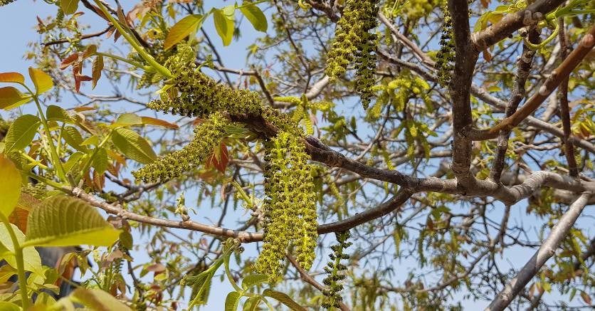 L’arbre est monoïque, il porte des fleurs mâles (chatons jaunes) et femelles (insignifiantes) distinctes sur un même sujet, et qui n’atteignent pas leur maturité en même temps. Les feuilles composées de 5 à 9 folioles pointues à base ovale, prennent une teinte bronze pourpré au printemps avant de verdir, puis jaunir à l’automne. Les feuilles sont alternes et portées par un pétiole de 3-4 cm.