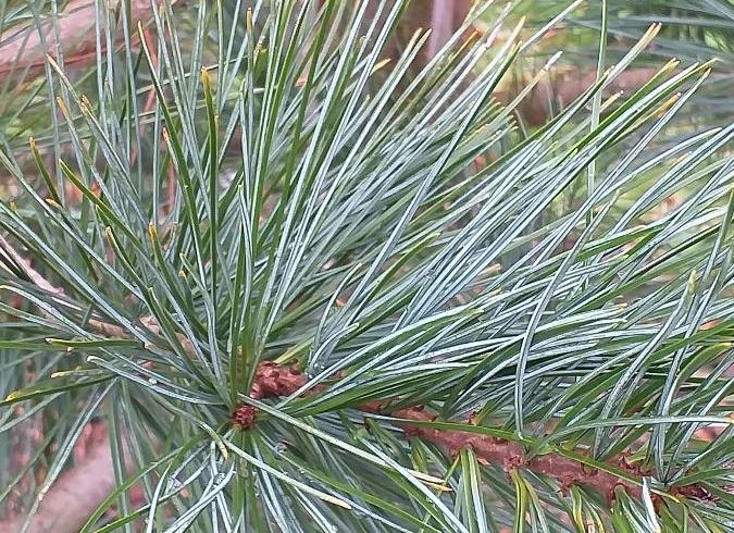 Ses aiguilles rêches, vert bleuâtre profond, groupées par 5, mesurent 10 cm de long tandis que les cônes mesurent 8 à 15 cm.