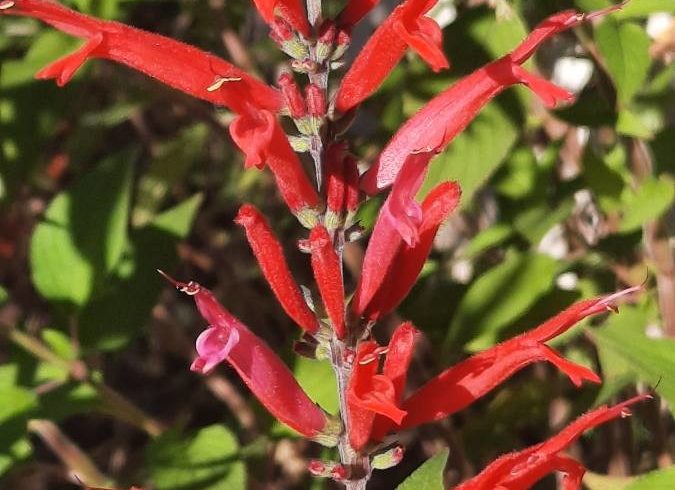 Salvia elegans produit un feuillage au parfum d’ananas tout au long de l’année si le climat le permet et des fleurs rouge écarlate généralement en fin d’été et automne. Riches en nectar, celles-ci attirent les abeilles comme les papillons.