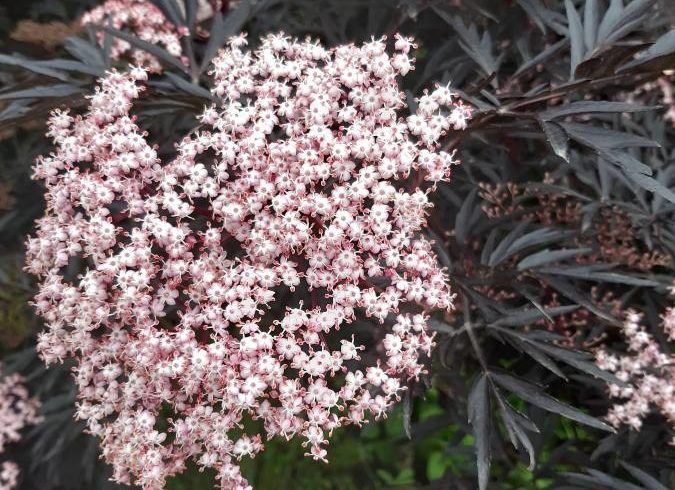 Le sureau noir ‘Black Lace’ est un cultivar que l’on apprécie au jardin pour son aspect très décoratif. Il porte un feuillage pourpre très sombre, finement découpé, qui sert d’écrin à des inflorescences rose pâle en été.